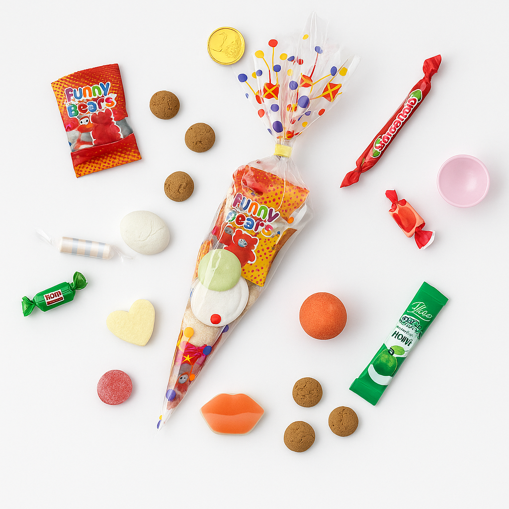 Inhoud: ufo, chocolade munt, gombal, snoeprolletje, snoeplippen, spekbol, kauwstaafje, reuze vruchtenhart, 6x kruidnoten, winegum smiley, zakje goudbeertjes, spekbol en fruitschelp
